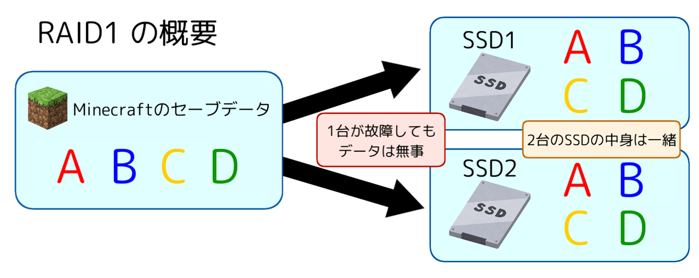 これにより、もしも1台のSSDが故障した場合でももう1台のSSDから復旧、サービスを継続することができます。